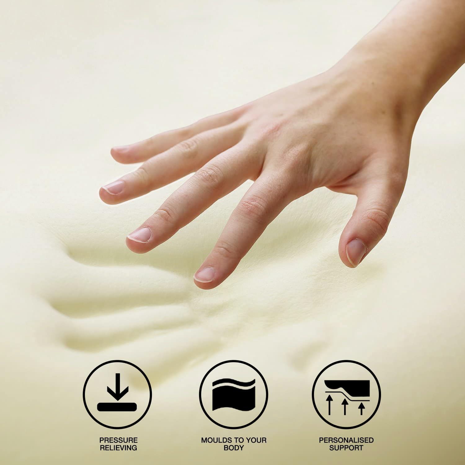 - MEMORY FOAM: A 4.5cm top layer of pure memory foam which moulds to the natural contours of your body, providing ultimate comfort and personalised support. The orthopaedic topper ensures your weight is distributed evenly, relieving pressure from key areas of your body including the back, hips and shoulders. The memory foam topper promotes a restful night sleep at a fraction of the cost of buying a new mattress.