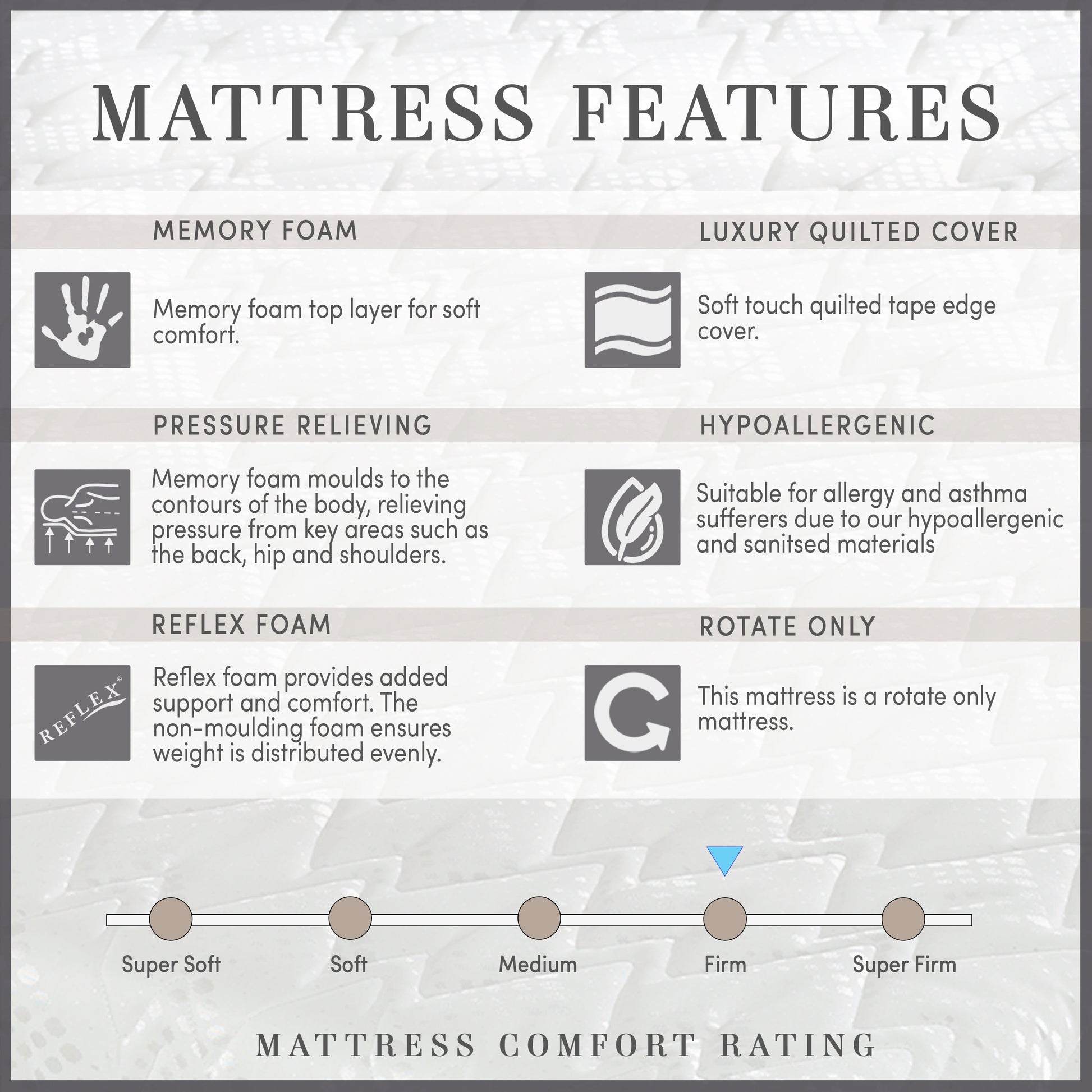 - The Memory Comfort Pedic mattress moulds to your body providing ultimate comfort and total body support across key areas including your back, hips and shoulders; spreading body weight evenly and providing improved pressure relief.